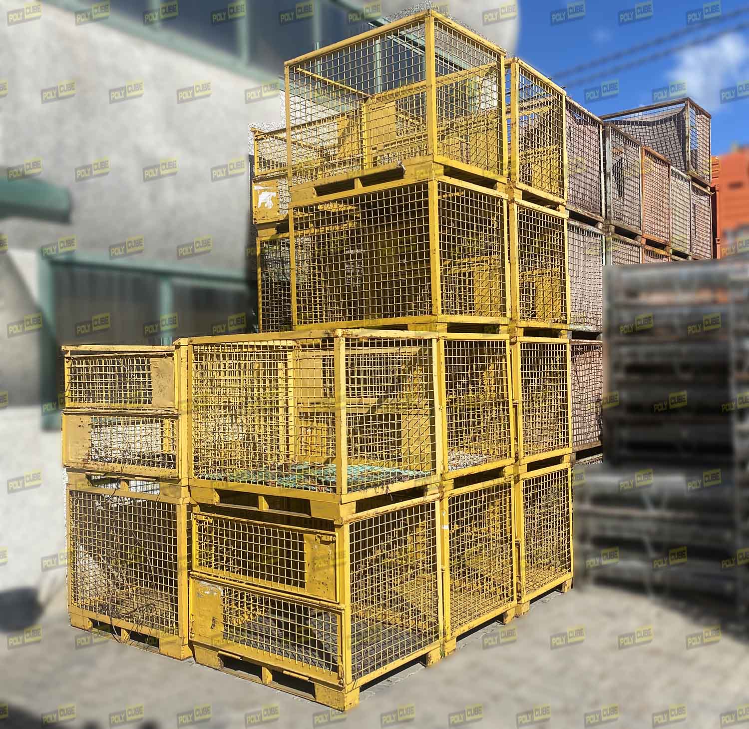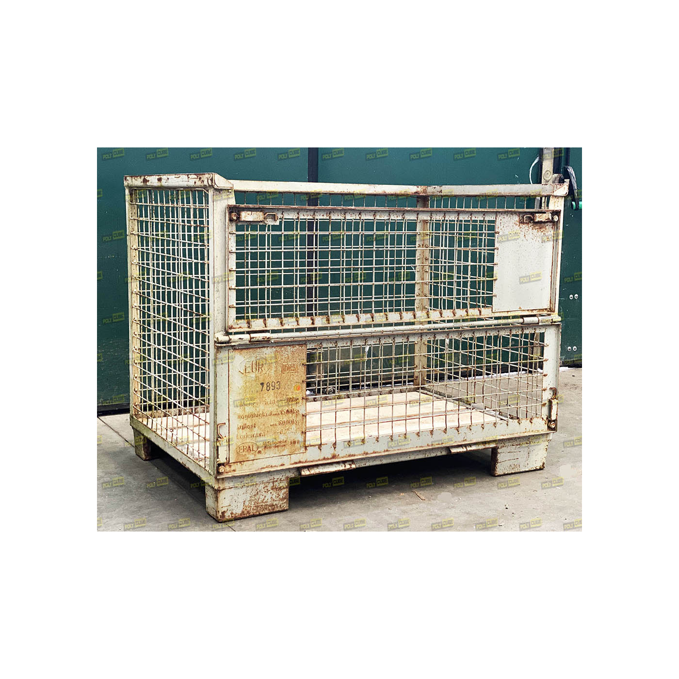 GITTERBOX USATI conformi alla norma Eur UIC435-3, inforcabili da tutti e 4 i lati. La base è fatta con traverse di acciaio e doghe di legno, le pareti sono in rete elettrosaldata. Hanno 4 gambe e sono impilabili ad incastro. È una tipologia di contenitore standard molto usato nel settore automobilistico, metallurgico, elettrico, produzione plastica e componendi in plastica, assortimento ferraglia, stoccaggio e assortimento di rifiuti elettrici ecc. ecc. Colori disponibili; grigio giallo e arancio
