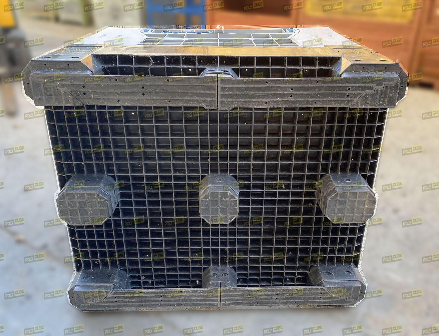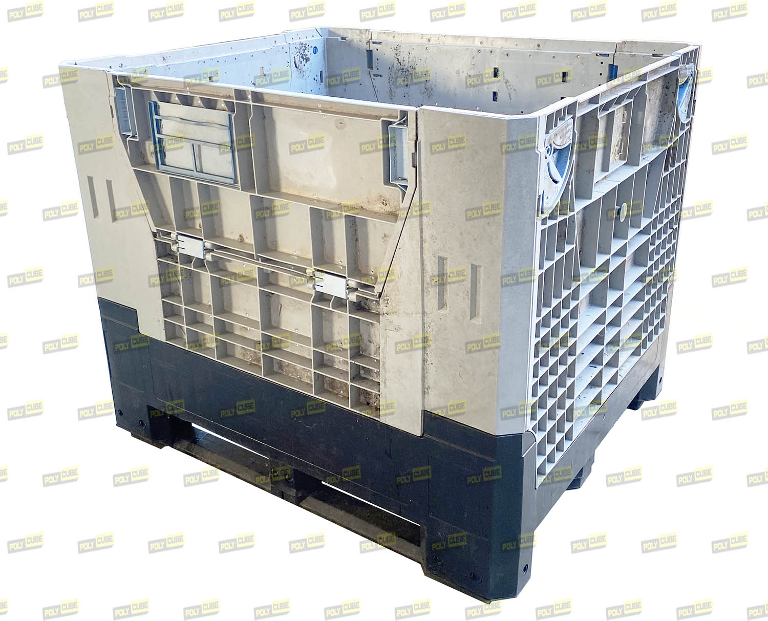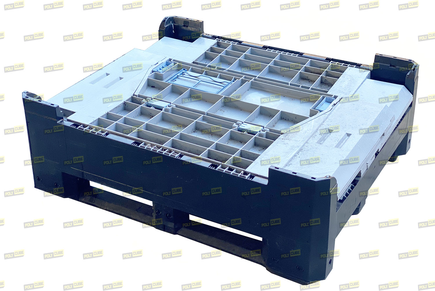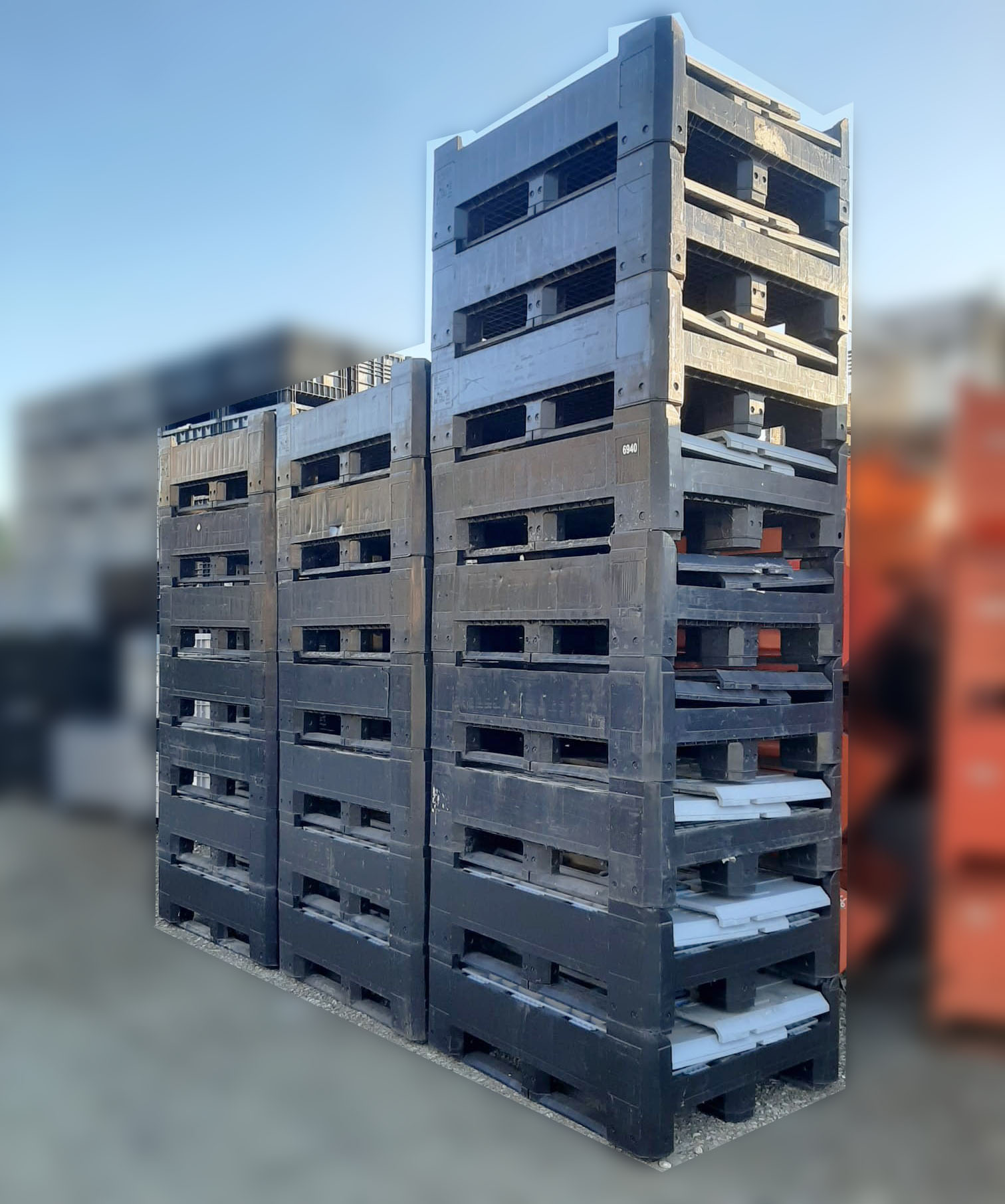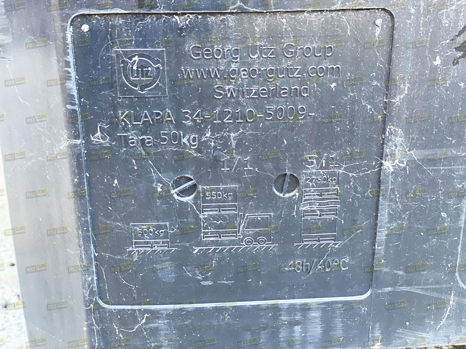 Contenitori industriali o palletbox in plastica abbattibili marca GEORG UTZ GROUP CH modello KLAPA34 1210-5009. Sono richiudibili per abbattere i costi della logistica di ritorno, sono impilabili ad incastro sia da aperti che da chiusi, la base è costituita da una robusta struttura a bancale con 9 piedi di appoggio e 2 pattini sul lato lungo. Hanno 2 sportellini per il prelievo del materiale anche quando sono accatastati ed il porta etichette.