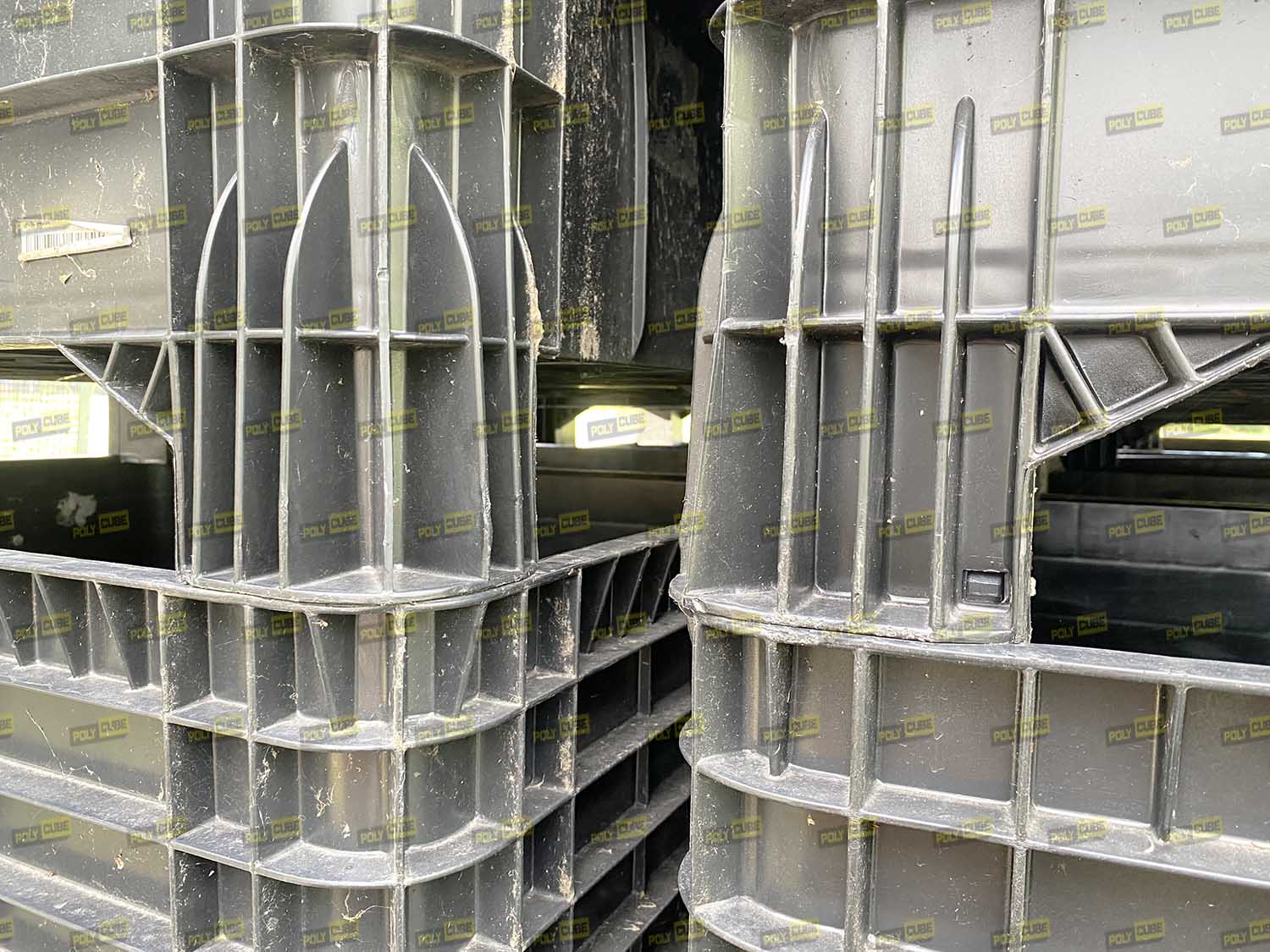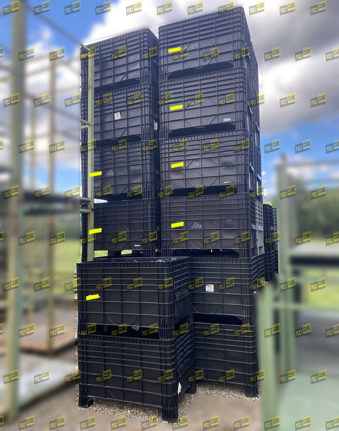 Contenitori o cassoni industriali usati realizzati in polietilene HD riciclato con 4 piedi, pareti e fondo chiusi, accatastabili ad incastro. Sono rinforzati con nervature e con bordo di risvolto.